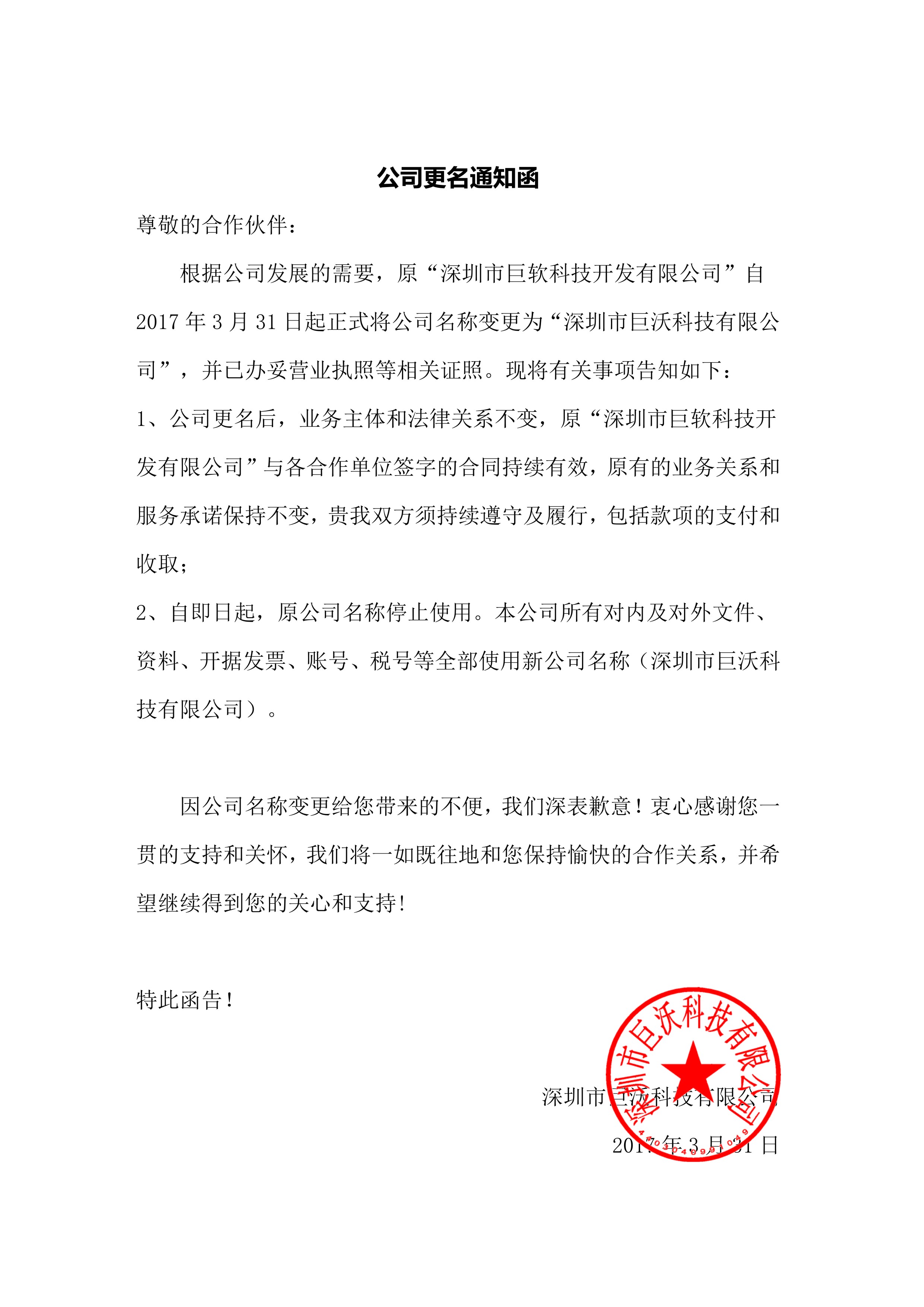 1、公司更名后,業(yè)務(wù)主體和法律關(guān)系不變,原“深圳市巨軟科技開發(fā)有限公司”與各合作單位簽字的合同持續(xù)有效,原有的業(yè)務(wù)關(guān)系和服務(wù)承諾保持不變,貴我雙方須持續(xù)遵守及履行,包括款項的支付和收??;
