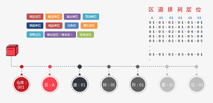無論是什么原則,當(dāng)你對(duì)倉(cāng)庫(kù)進(jìn)行劃分后形成一定的區(qū)域,這些區(qū)域用來存放貨品的位置就是庫(kù)位。必須要對(duì)這些庫(kù)位進(jìn)行編碼??紤]到必須保證編碼唯一性,目前巨沃推薦的編碼主要是“三維定位法”,如:“A-01-01-01-01-01”,表示A區(qū)第一條道第一排第一列第一層第一位的那個(gè)庫(kù)位(如下圖所示)。并且最好在貨架上標(biāo)明一下區(qū)位,就更加清晰明了。